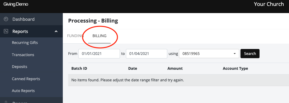 - At the top of the Deposits page, click the Billing tab.