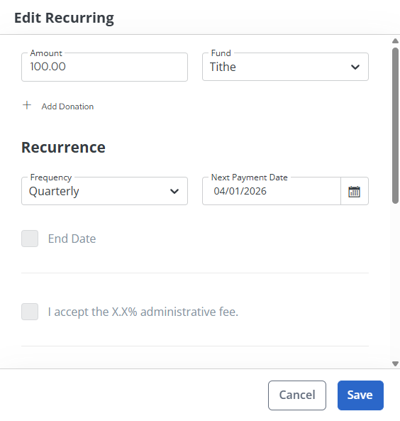 - Click the Edit button to edit the Amount, Fund, Frequency, Next Payment/End Date, or whether you would like to cover the administrative fee.