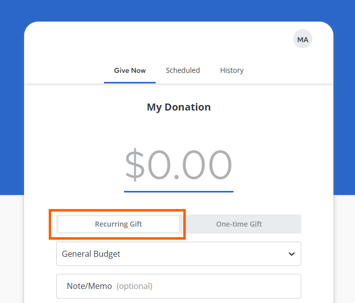 Once on the giving form, select the recurring tab to initiate your gift.