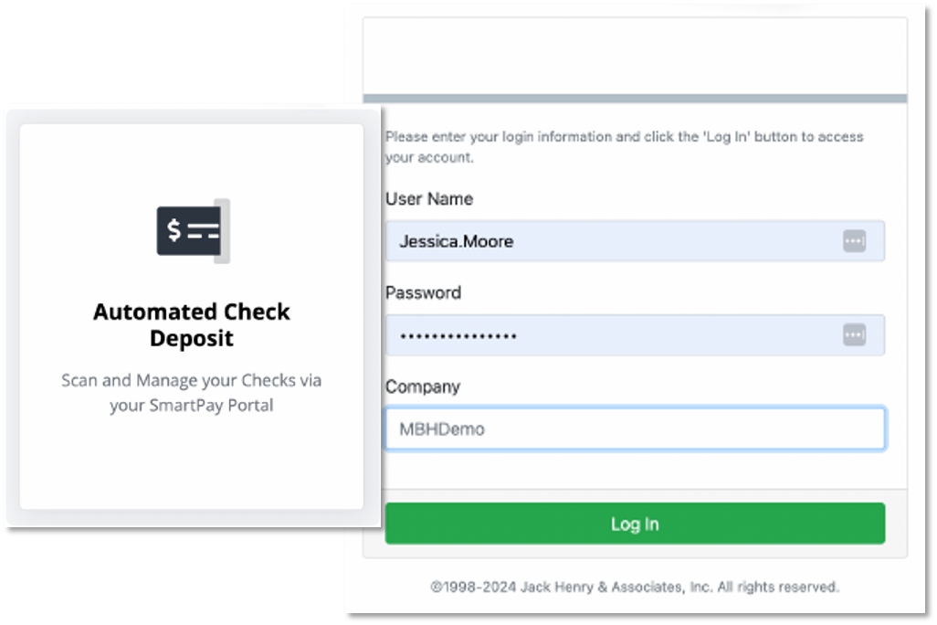 After you have been successfully onboarded to Jack Henry, you will receive a login email with your username and temporary password in addition to your company name.