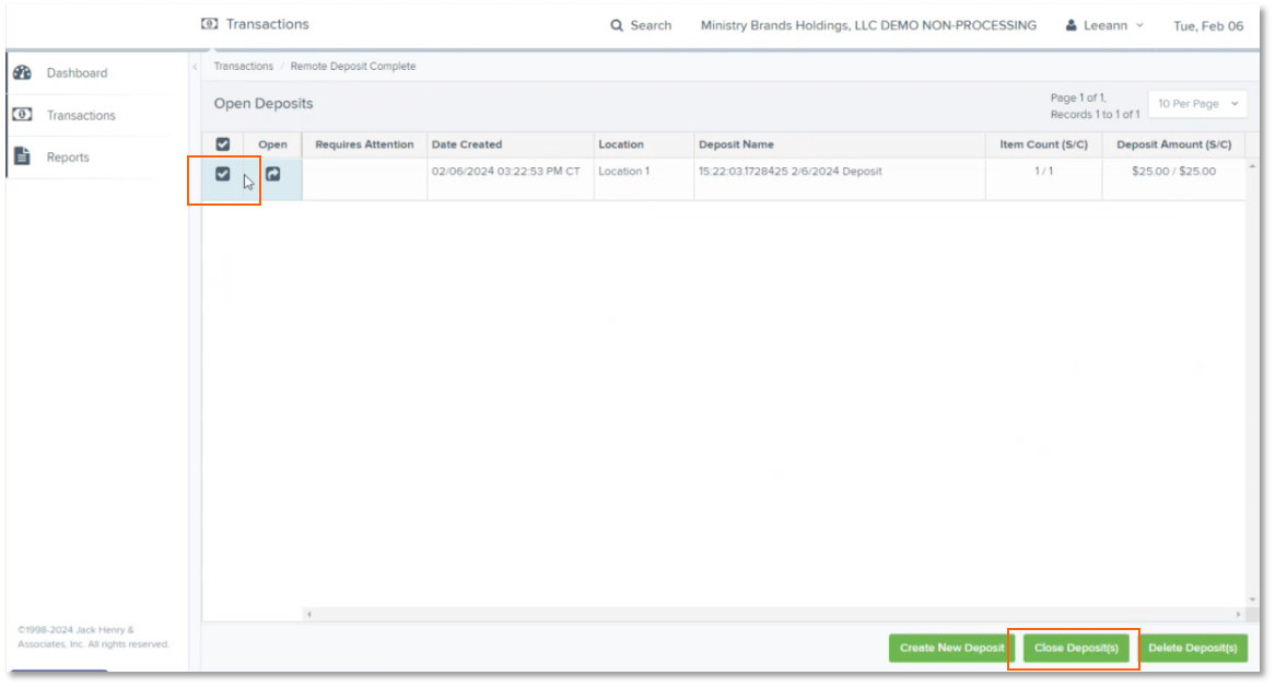 Note: selecting Close Deposit doesn’t immediately send the checks to be deposited, they are sent at 7 PM CST each day – this allows multiple batches to be sent at the same time which reduces costs for you!