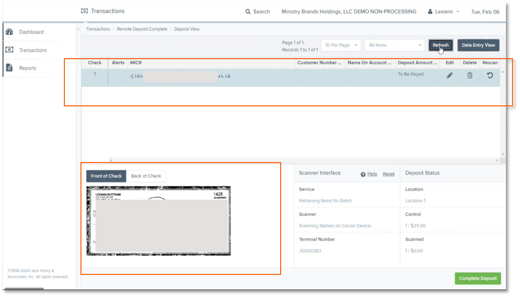 Additionally, you may see alert icons indicating that a MICR number was unreadable. Try clicking Refresh at the top of the grid after a few minutes to see if it clears up. If it doesn’t, you will need to rescan the check by clicking Rescan on the far right of the check’s row.