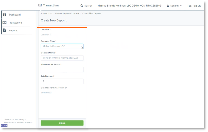 - To scan and deposit checks, click the Create New Deposit button in the bottom right of the screen. Best practice is to create a batch for each Fund or giving opportunity.