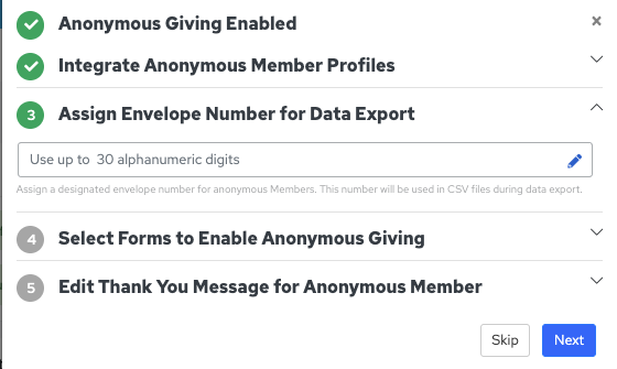 - Enter an envelope number (up to 30 alphanumeric digits) to represent anonymous donors in exported CSV reports.