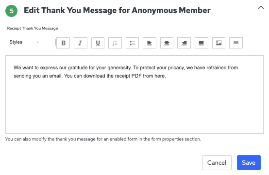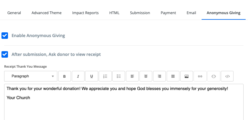 We highly recommend enabling this and encouraging donors to save the receipt. It includes the order number and transaction date, which are required if a donor ever requests a refund. - (Optional) Customize the Receipt Thank You Message shown to anonymous donors within each individual form. Updating the thank you message here will not update the message in all other forms