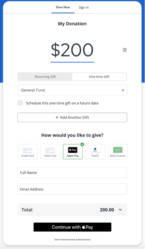 Apple Pay simplifies giving when using Apple devices (iPhone, iPad, or Safari browser).
