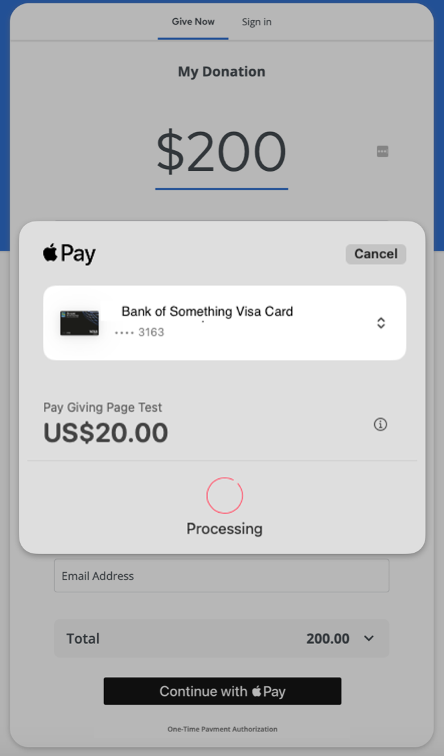 Note: Apple Pay is only available to donors accessing the form from an Apple device or Safari browser.