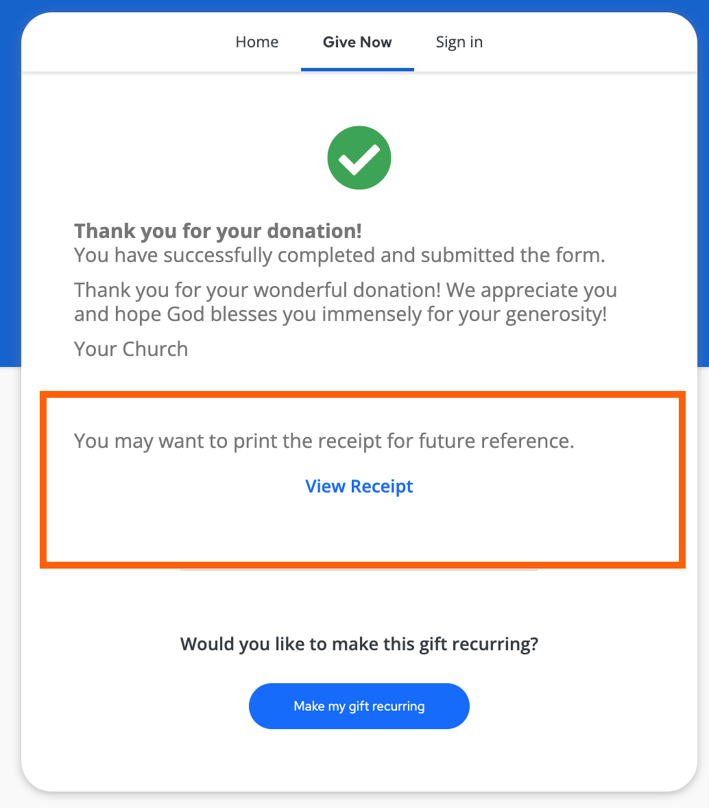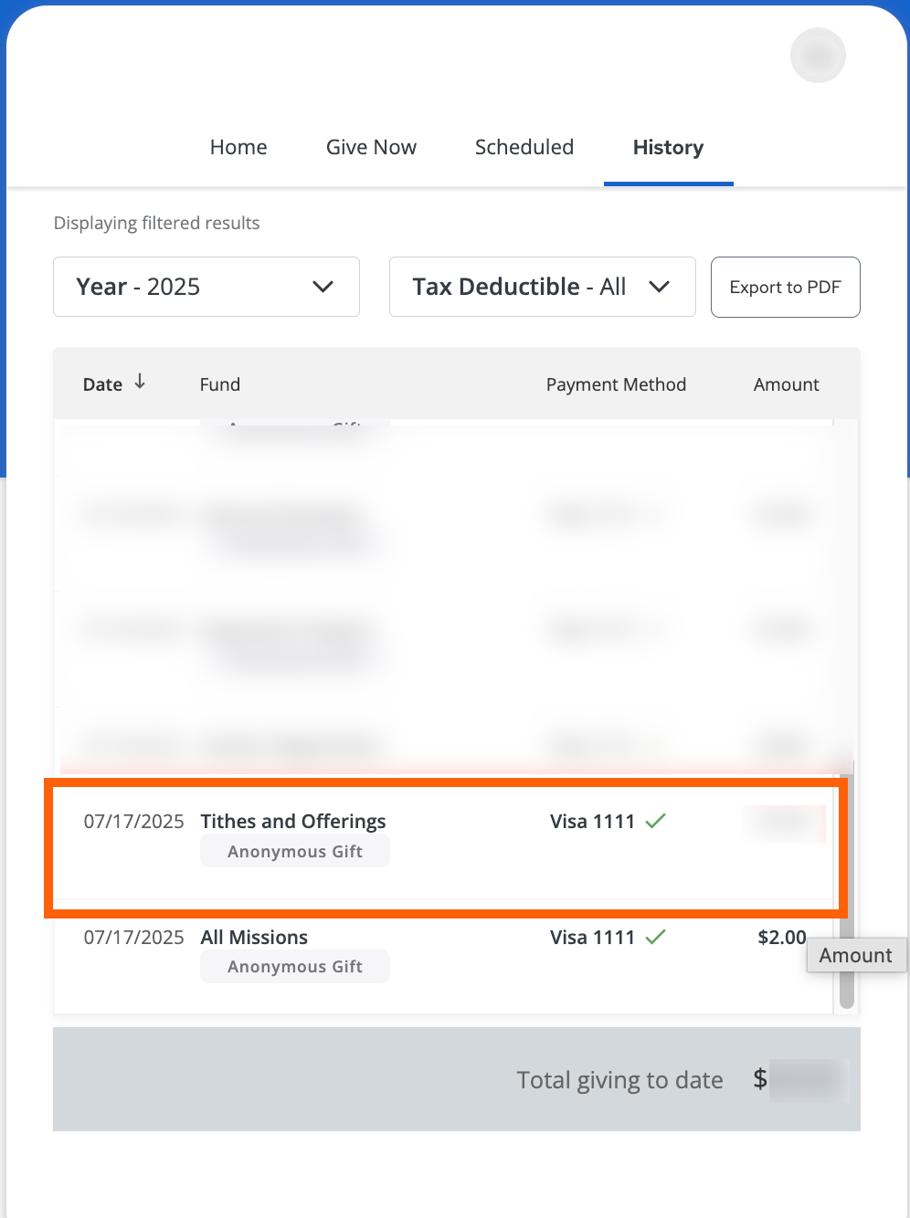 - You can view your anonymous donations in your giving history, even though they won’t be attributed to your name on the church side.