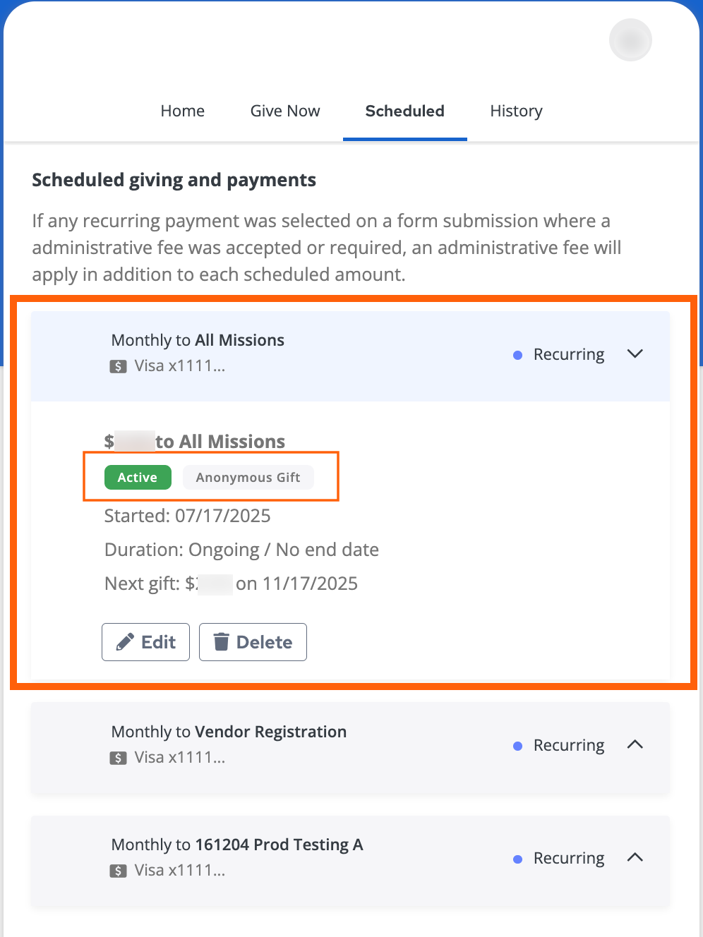 - You can schedule recurring anonymous gifts and view them in your donor portal.